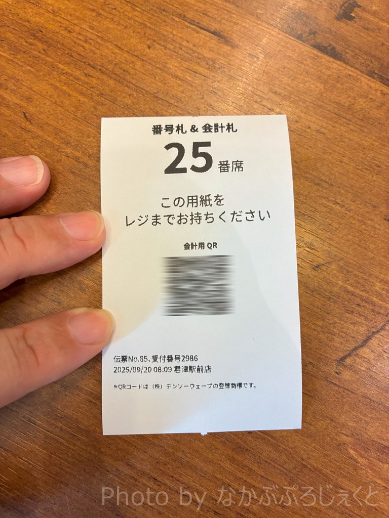 お店に入るとお出迎えしてくれるのは笑顔の店員さん…ではなく自動受付機で、そこで席の番号が書かれた番号札を発券します。(もちろん操作がわからないときは店員さんが来てくれます)